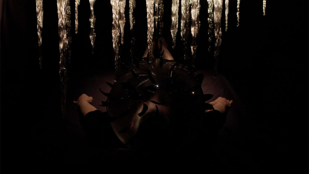 Hanging from a large-scale plumb bob or plummet, thousands of glass icicles crash together in a cacophonous roar, tolling end times to radically alter our impact, waste, and behaviour. Propelled by performer/maker Carrie Fertig, the plummet swings on a threatening trajectory. Fertig wears an isolating glass bubble covered in shards of black glass on her …